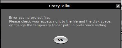 "Error saving project file. Please check your access right to file and the disk space, or change the temporary folder path in preference setting."