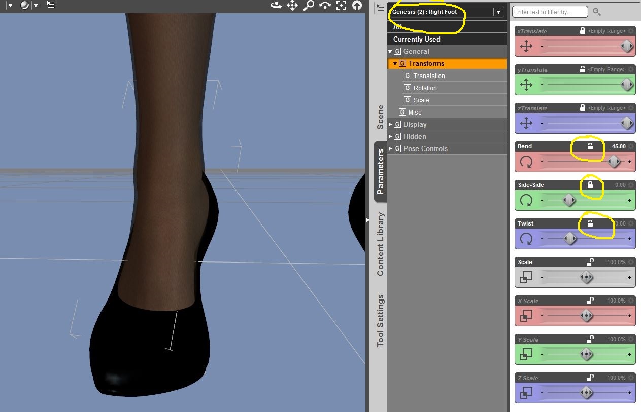 Just in case anyone still has problems with this and would like to take care of it all on the DAZ side before 3dx5 I hope the following images will help. Before exporting your character from DAZ as an .fbx file select the right or left foot, in parameters lock the bend, side-side, and twist sliders. Do the same for the toes and big toe. Repeat for opposite foot. Next select the right or left high heel shoe, in parameters lock the X rotate, Y rotate, and Z rotate sliders. Repeat for opposite shoe. Nothing is necessary in 3dXchange. When the character is applied to iclone it works fine. The third photo shows the heels during the Gwynn walk motion. Hope this helps!