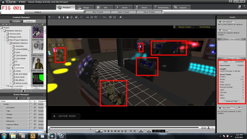 Hi, folks, This is your friendly neighborhood Martok2112 (Steve) with yet another hopefully useful tutorial. Today's tutorial will demonstrate how to utiilize multiple avatars (more than four) in a high-poly shoot situation. Again, for demonstrative purposes, I will utilize materials from my upcoming Battlestar Galactica projects. The bridge of the battlestar Galactica is a huge place, and should be rife with human activity as it takes quite a few people to run a ship that is over a mile long. I think my bridge is actually bigger than the bridge as seen in the original 1978 series. :)  As you will notice in Fig 001, my project has called four 10 avatars (actually, 11, as in one shot, I did add another character, but it was a stand alone shot, for the purposes of this demonstration, we will only need the initial ten). It also shows four cameras being used. Almost all of them will have dynamics of some form or another. And CRIPES, look how many props there are!!!