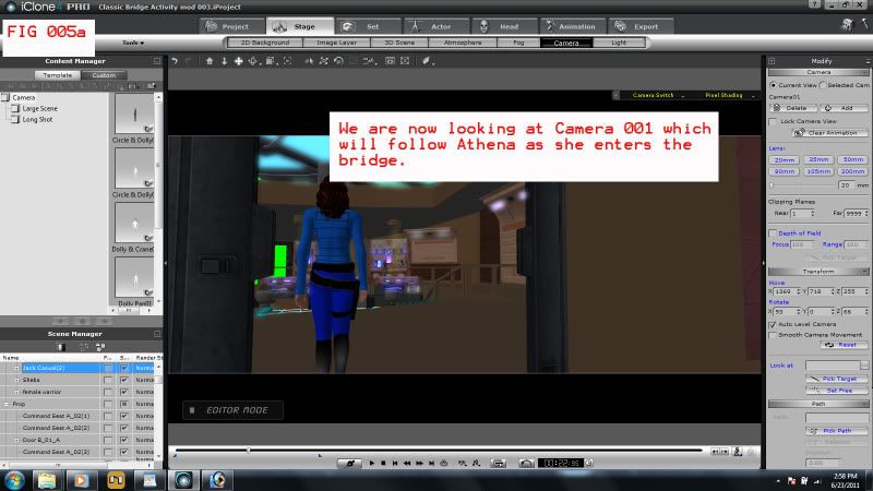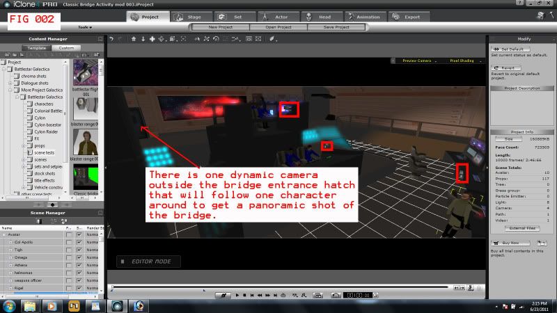 Nine of the ten characters are highlighted in Fig 001, and three of the four cameras are highlighted in Fig 002. Camera one, which is outside the bridge, is the camera that will follow Athena as she enters the area, and establish the panoramic shot of the bridge. Now, the problem is, there are too many characters at once for a single shot. Previous attempts to export this shot in 720p/24fps/High Quality Video have resulted in only a couple of seconds of footage being rendered, as opposed to the full length of the shot. How then, do we take care of this shot so that we don't have to cut corners? I mean, this is supposed to be a pretty impressive establishing shot. Well, first, after we have established our camera angles and paths, and where our avatars are supposed to be placed, accounting for any animations like operating bridge controls, or making small movements, we SAVE the project. This allows us to come back to our project fully restored, because what we are about to do calls for some deletions.