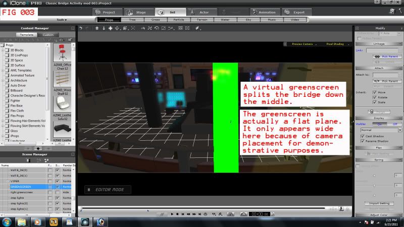 First, we're going to have to establish a virtual green screen....ideally, one that will split the bridge down the middle....and at least at a point where the establishing camera will not cross over the green screen. See Fig 003. Use a "plane" object, color it green, and place it down the middle of the bridge. Make sure that no avatars pierce through the green screen.  Fig 004 shows that the virtual green screen has been established, and now we need to delete the highlighted characters on THIS side of the green screen. The camera tracking Athena is on the other side of the green screen, and does not need to see these characters right now. Deleting the unnecessary characters frees up performance memory. DELETE, do not TURN OFF. Turning off the characters does nothing to help free up memory. The only characters remaining are the three that are on the opposite side of the green screen.. Athena, another female warrior, and Sheba.
