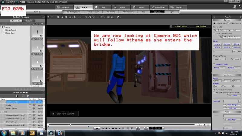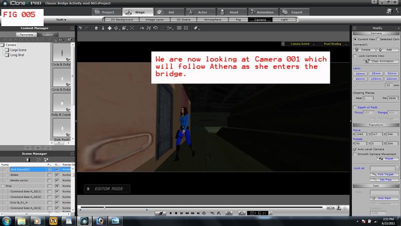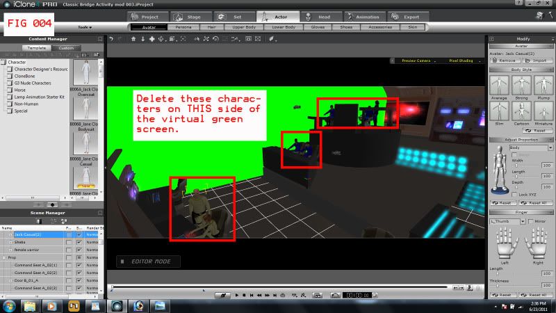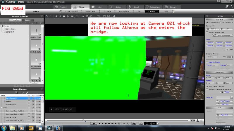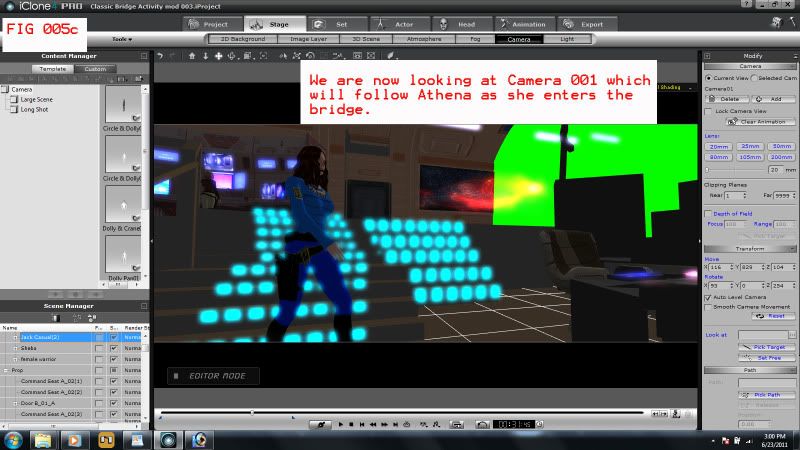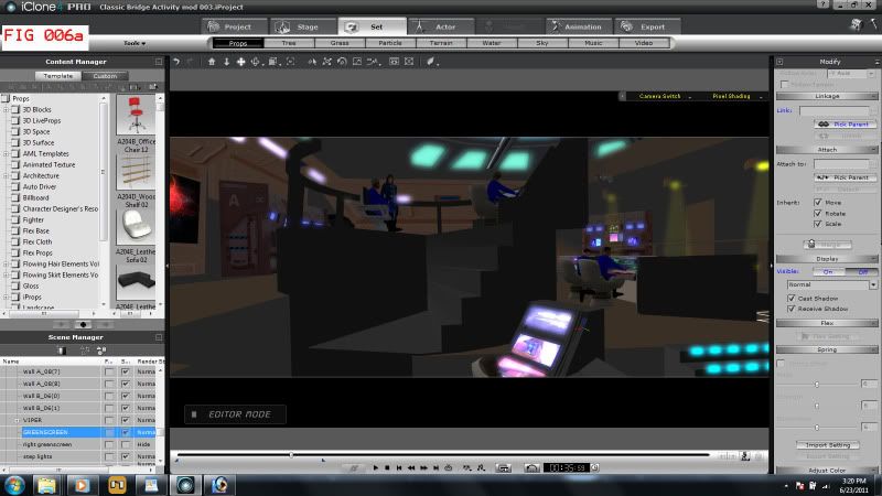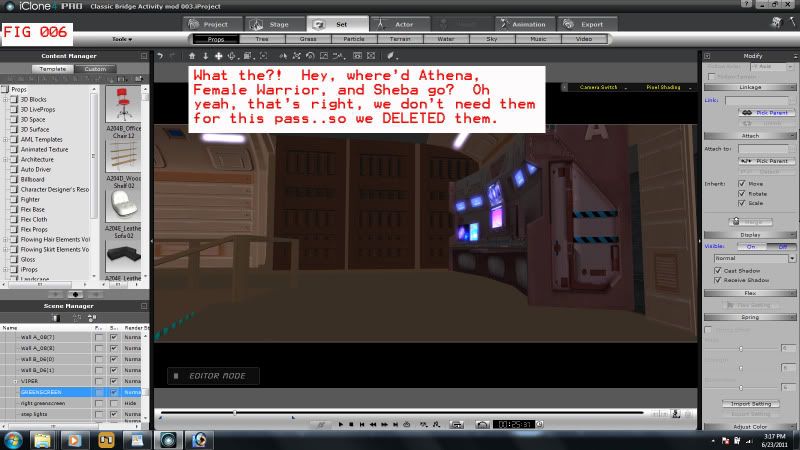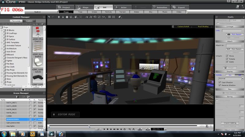 Now, we check to make sure that playback took at the settings we've requested...and voilla. You now have the first half of your shot. Now, we reload the project (you did remember to save before you started deleting things, right? :) ) Now we do a second pass. This time, we turn off the virtual green screen, DELETE the previously rendered characters (Athena, Female Warrior, and Sheba.) We also don't really need to see Rigel or her subordinate for this shot, since they would only be seen for the briefest split second. So go ahead and DELETE them from this second pass. What you will see in this second pass is Commander Tigh, Col. Apollo, Omega, and the helm and nav officers. See Fig 006-006b.    Export the shot. Now you have two passes, ready for compositing in an external movie editor...I use Magix Movie Edit Pro, since it allowed me to discover iClone.