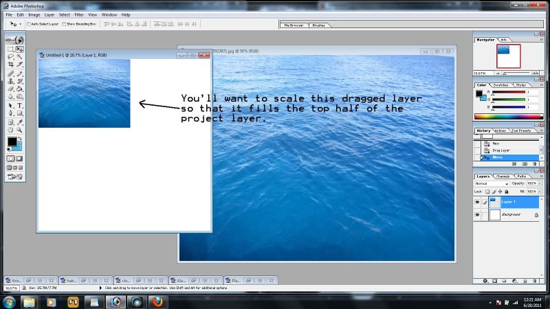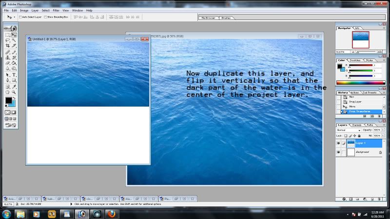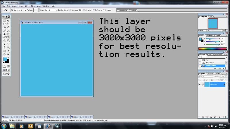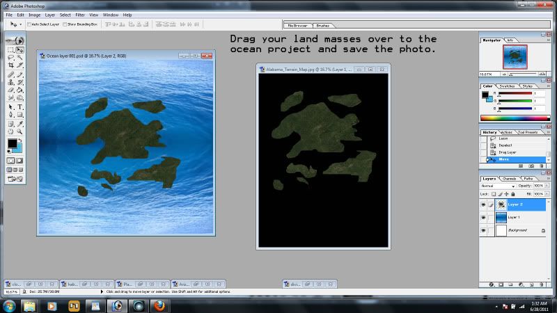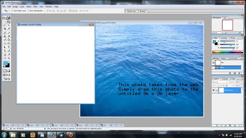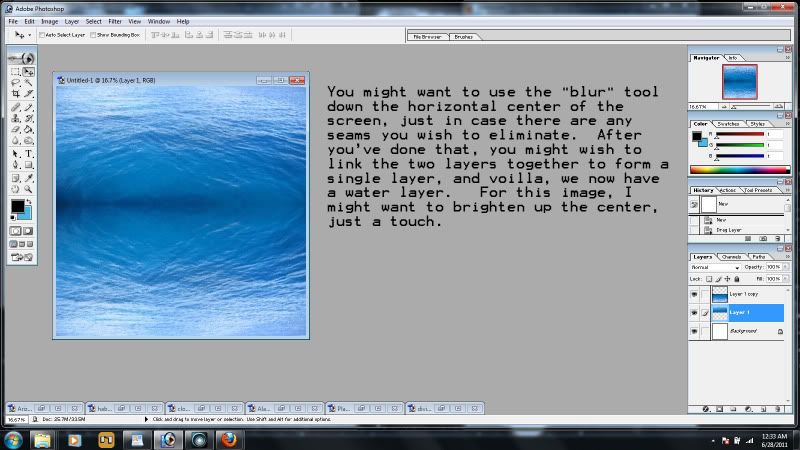 For each section of the planet, you're going to need to probably create a separate photo project, each around 3000x3000 pixels. Or maybe half that....but since you might want to use high-res photos for your planet's textures, 3k x 3k is a safe bet. Ok....first, the water layer....now you can do this one of two ways...you can either paint/fill a straight blue color....for more of the cartoony look which is the simplest approach....or you can go for the more photorealistic look by Googling (or whichever search engine you prefer) photos of the ocean....some top down views would be good. If you go for the photorealistic look, I would recommend that you take that photo, make it a layer on your water project, scale it down to half its vertical size, and move that piece to the top of your water layer photo-project. Then, duplicate that layer and flip it as a vertical mirror image of the previous layer, move it to the bottom half of the project. Most of the rescaling and mirroring/flipping functions are found under the Edit tool in the toolbar of PhotoShop. Once you've gotten both layers in place, link them, and then merge them so they form a single image. Then you might want to use the SMOOTH tool to work out any seams you might have along the horizontal center. When you're done tweaking your ocean image, save it as a jpg or bmp, name it and locate it appropriately, and voilla.