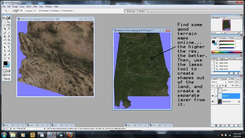 Now we move on to the land layers. As with the ocean layer, look up some top down views of land on the Internet. Get all the different types you can, forest, jungle, desert, arctic....and again, they're best if they are top-down views. Now, what you'll want to do with the land photos are go into either the lasso or polygonal tool, and start creating shapes within the land. Now, I'm not a topographer, or a geologist, so don't ask me about plate techtonic theory and stuff like that...and honestly, you shouldn't really have to worry about that either. LOL! Ok, you've made your land mass shapes? Good, now, make the polygonal or lassoed shapes into a new layer, and then turn off the back ground layer. Cool. Now, drag your land mass layer over to the ocean layer project, and scale accordingly, depending on how much you want your land masses to cover the ocean. When you're satisfied, save this as a jpg or bmp. Keep in mind that your landmass oceansphere is going to have a mean assed seam on the back of the sphere....that's an area we really DON'T want to photograph when rendering for our space scenes...but it's alright because most sci fi movies rarely, if ever, show a planet in its entirety. So in effect, every time you photograph/render this planet, you're gonna wanna give us its "best side". :)