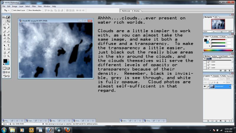 Next, the clouds. Clouds are almost self-sufficient in terms of creating an opacity layer for them, since there are different levels of density in the clouds. Remember, BLACK is invisible, GREY is see-through, and WHITE is fully opaque. All we want to worry about is blacking out the blue sky around the clouds....so use whatever method you're comfortable with, and make the blue sky areas black. By doing this, you can use the same jpg/bmp for both diffuse and opacity layers on your cloud/atmosphere.