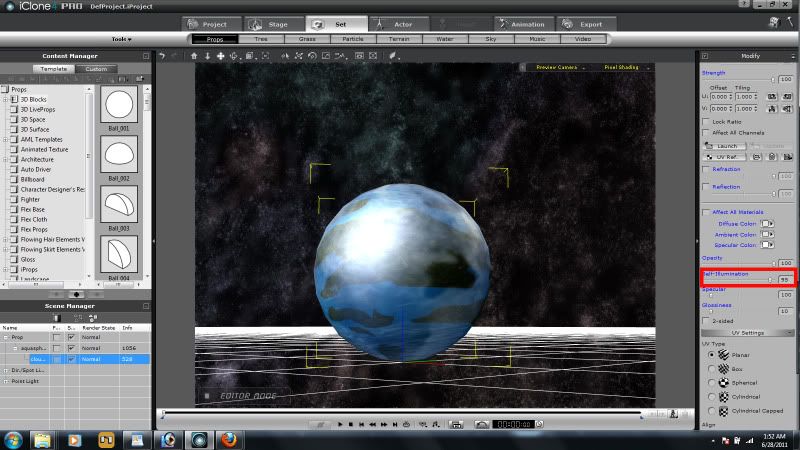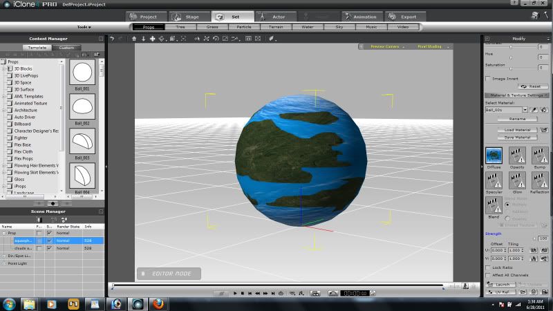 Alright, now we go to iClone... We're going to make two spheres, each one ever so slightly larger than the other. First the aqua and land mass sphere. Go into SET>PROPS>TEMPLATE>3D BLOCKS and select a "ball" primitive. Then simply click on the DIFFUSE box under Material and Texture settings, and place your water/land mass photo , or your flat shade of blue with land masses. Voilla, you've just created your water and land mass sphere.