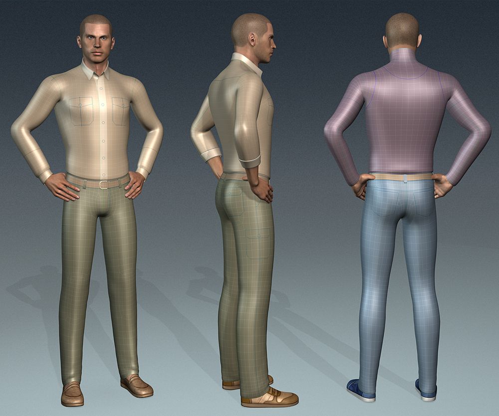 Main Features: - 10 cloths models and much more combinations; - Complete skin layer for Upper and Lower body parts with hi-resolution textures; - Lower cloths layer with additional element for belt creation; - Up-to 2 cloths layers for upper body plus additional layer for details; - Identical texture layout for all lower cloths; - Unified texture layout for all upper body cloths elements and layers; - Material layout for all cloths models optimized for easy and comfortable texturring.