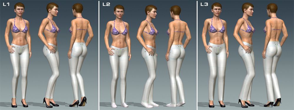 Shoes fitting. Unfortunately High Heels creating procedure recommended for G5 (Flat Shoes and High Heels shoes must have the same foot bone rotation) cause some problems with skinning bottom of pants -- it's not possible to make universal skinning for long and/or wide pants which will has natural bottom deformation for both Flat and High Heels shoes when character bend foot. L1 model of pants rather tight and short and this issue practically does not affect on this model. Initially L1 model have been skinned for High Heels shoes but You will have no visual issues in wide range of foot bending for flat shoes too. Although if You wish completely avoid this issue You should make this pants a bit shorter (apply opacity mask up-to first bottom guide line in template) for using with flat shoes. L3 trousers in most of cases used with High Heels shoes, so it was skinned for High Heels. Using L3 with flat shoes can cause issue (pants-to-shoes intersection) on foot bend (or they must be shorter). L2 (classic jeans) commonly used with both flat and High Heels shoes, but this model does not allows universal rigging. So I have to include separate models for fitting to different types of shoes -- L2f and L2h. Both modifications have absolutely identical shape, but L2f rigging to fit Flat Shoes and L2h - High Heels.