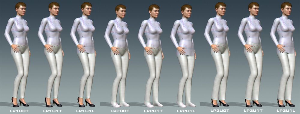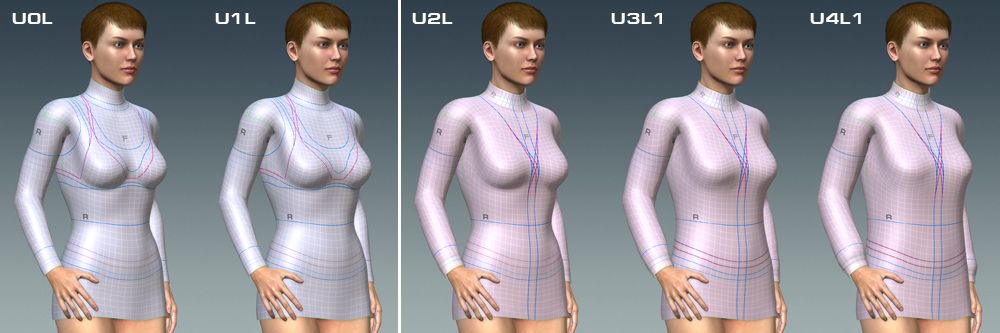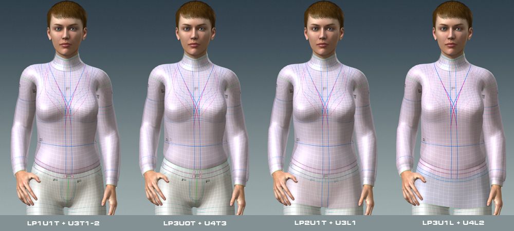 Upper models U0-U1 and U3-U4 also have tucked (UxT) versions; U4 has additional loosed (UxL) version. Shapes U0 and U1 (both tucked and loosed versions) represent first upper cloths layer (UpperA). Upper shape U0 is different from others -- it has no cloths relaxation between breast (all other have natural relaxed look in this zone). U0 useful for top underwear creation (if it will be visible through second upper cloths layer UpperB).
